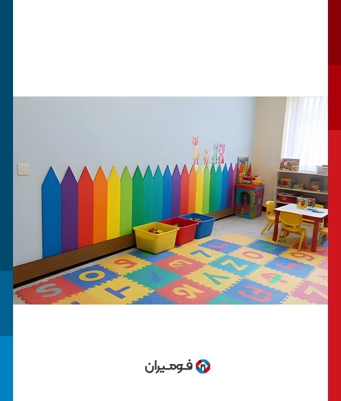 - غطاء جدران رياض الاطفال: الاطفال يحبون اللعب كثيرا واللعب لا يحدث الا بالاصابه إما في البيت او خارج البيت . مع الاسف البالغ في الوقت الراهن بسبب الظروف الحياه،الاطفال مجبورون ان يقضوا كثيرا من اوقاتهم في البيت او في رياض الاطفال . في كلا المكانين قد يحدث الاصابه عند اللعب وهذا طبيعي . ولكن من الافضل ان نجعل البيئه اكثر امانا للاطفال . و هذا هو احد تطبيقات مغطي فومي الجدران هذه المغطيات يتصل بالحائط بسهوله ويمنع الإصابه و الضغط الناتج من الاصطدام بالجدار .
