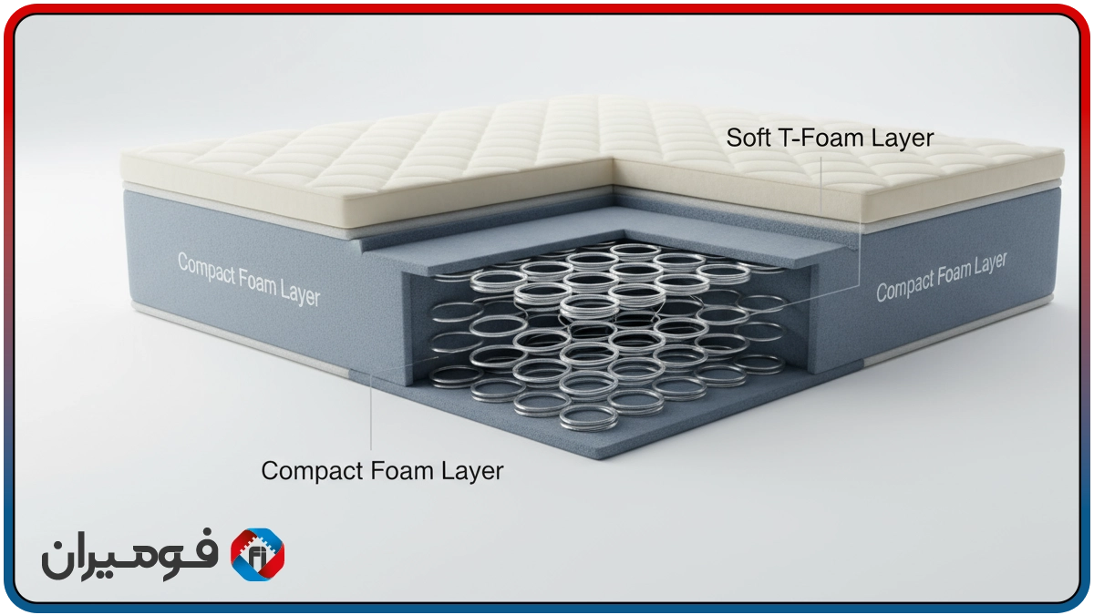 In the construction of the spring mattress with compressed foam sheet and soft T layer, first, both sides of the spring cage are covered with a compressed foam sheet with a thickness of 3 to 6 mm. This harder layer distributes the shock and pressure of the springs uniformly and prevents the transmission of sound and movement to other parts of the mattress. Then, a layer of soft T foam with a thickness of 8 to 20 mm is placed on the surface to create comfort and a soft feeling in contact with the body. Finally, a fabric or laminated cover is added to achieve a beautiful appearance and greater durability.
