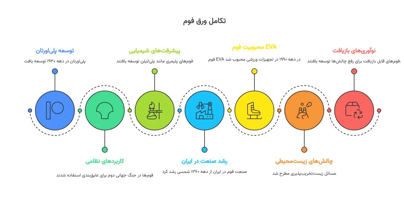 В 1950-х годах прогресс в химических процессах привел к производству полимерных пен, таких как полиэтилен и полистирол, которые обеспечили легкость и отличную изоляцию. Поверхностно-активные вещества сыграли ключевую роль в стабильности пены и облегчили ее производство. В Иране индустрия пеноматериалов начала развиваться с 1980-х годов, а такие компании, как «Фумиран», занялись промышленным производством с 2002 года.